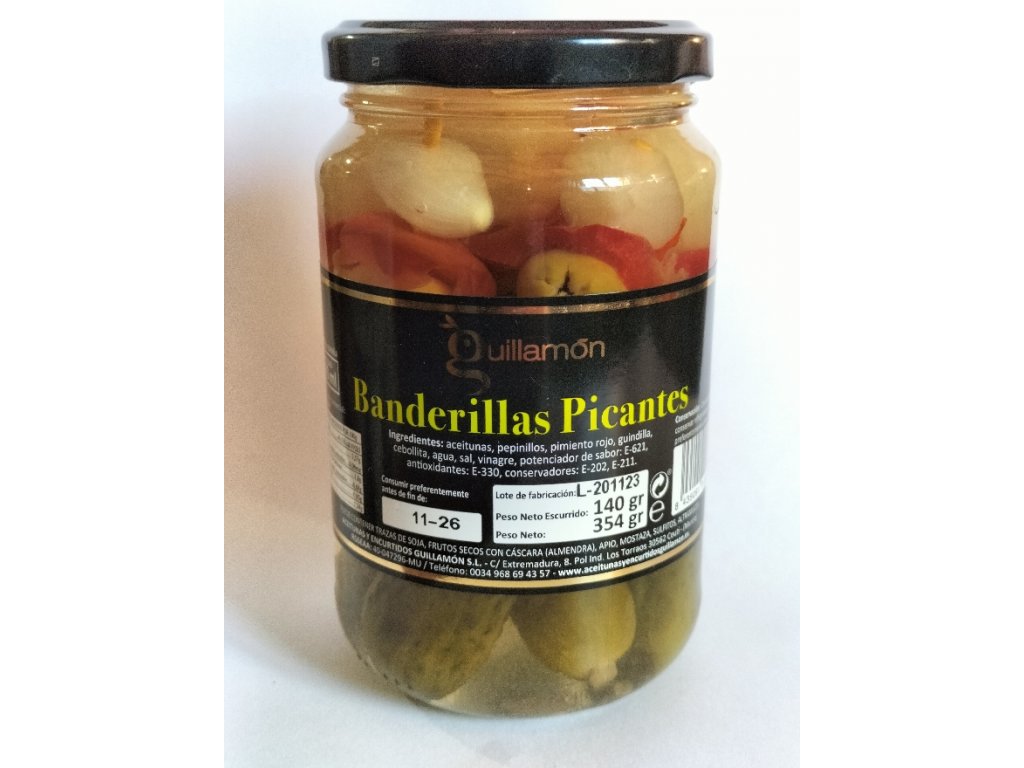 Složení: olivy, okurčičky, červená paprika, paprika kozí rohy, cibulka, voda, sůl, vinný ocet, látka zvýrazňující chuť a vůni E621, antioxidant E330, konzervant E202, E211